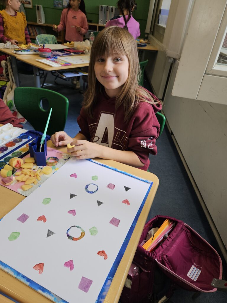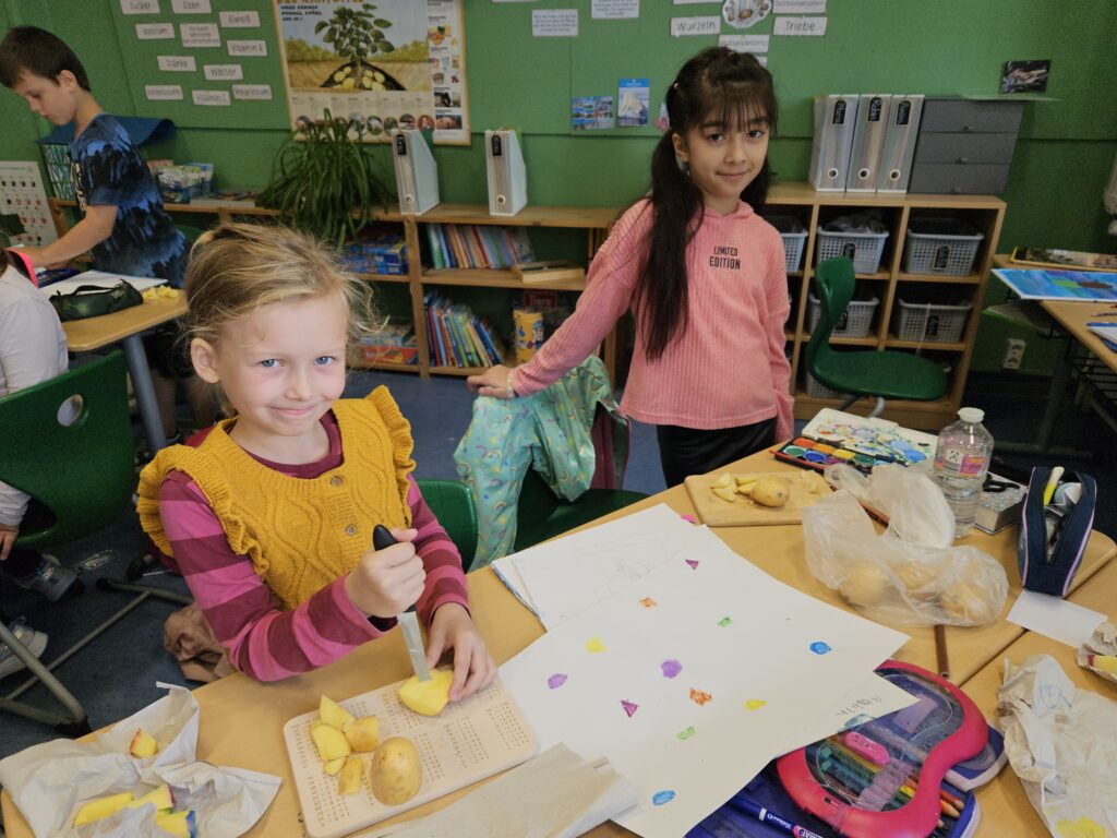Die Kinder des 3. Jahrgangs haben sich in den letzten Wochen intensiv mit der Kartoffel beschäftigt. Neben der Herkunft, der Entwicklung der Pflanze, den Inhaltsstoffen und dem Kartoffeltrick von Friedrich dem Großen, wurde im Kunstunterricht mit Kartoffeln gedruckt, leckere Kartoffelgerichte gekocht und die Entwicklung des Kartoffelkäfers beobachtet.