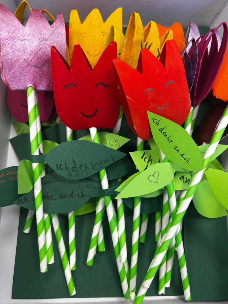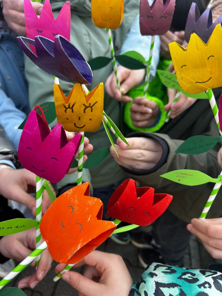 Eine Station war im Reinheimer Pflegeheim, wo die Kinder die Bewohner und Mitarbeiter mit selbstgebastelten Tulpen überrascht haben. Das Motto der Aktion: Leben mit Jesus hat Folgen-das Kreuz gemeinsam tragen.